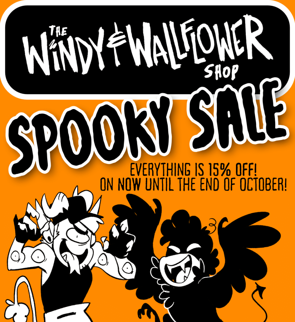 That’s right! Our annual SPOOKY SALE is going on RIGHT NOW on our shop! Everything is 15% off, until the end of October! Which is… next week! Sorry for the jumpscare! But best get on these cool deals before they slink away…